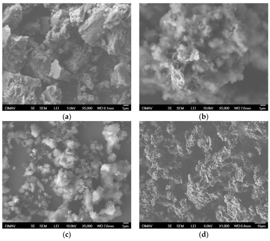 Figure 4 shows the morphology of pure SiO2, materials modified with 3.6 and 5% mol hafnium, and the material impregnated with 12 wt% sulfate ions. 5.0Hf/SiO2 and 12SHf/SiO2 exhibit irregular morphologies with a tendency to agglomerate particles of variable size, forming large cavities between the agglomerates. Only 3.6Hf/SiO2 shows a morphology of homogeneous particles similar to that observed in pure silicate. All the materials exhibited porosities classified as mesopores and macropores that correlate with the characterization results shown in Figure 3b.