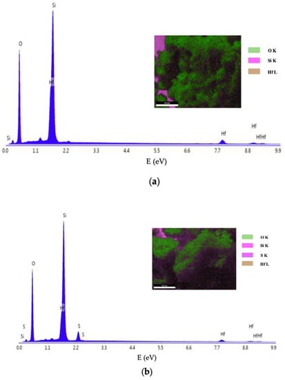 EDS analyses of 3.6Hf/SiO2 and 12SHf/SiO2 are shown in Figure 5, both samples comprising Si, O, and Hf. Additionally, sulfur (S) was identified in the spectrum of the 12SHf/SiO2 material, corresponding to the presence of ions used to increase the acid strength of 3.6Hf/SiO2. Hong et al. [26] carried out an EDS analysis on MCM-41 showing elemental compositions of silicon (Si) and oxygen (O) similar to those observed in these spectra. Table 2 shows the atomic percentage of the elements constituting the catalysts. This quantification of elements was carried out in different sections of the samples, showing that Hf and S are not homogeneously distributed. However, as the analysis confirmed the presence of Hf (3.42%), the amorphous structural form of HfO2 is verified.