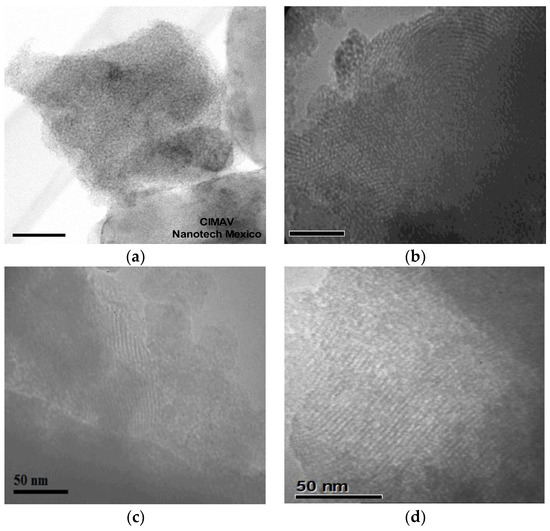 Figure 6 shows the micrograph of the synthesized catalysts. SiO2 shows a structural arrangement consisting of uniform channels similar to that reported by for a mesoporous MCM-41 type silicate. However, the signals of the (110) and (200) planes obtained by XRD of the pure mesoporous silicate are not well defined, thus confirming that the material has an incipient structural arrangement similar to MCM-41 but poorly ordered. On the other hand, the presence of 3.6% mol of Hf in the silicate caused the loss of the structural ordering observed in the SiO2 micrograph due to the formation of amorphous HfO2. Higher metal loadings lead to amorphous structured materials. This same behavior was also observed with the 3.6Hf/SiO2-sulfate material directly impregnated with 12 wt% ions.