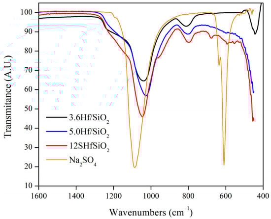 Infrared spectra of the synthesized materials are shown in Figure 7. All three materials have signals at 460 cm−1, corresponding to metal-oxygen bonds, specifically Si-O and Hf-O bonds [13,23,27]. Inverted peaks at 810 and 1080 cm−1 correspond to symmetrical and asymmetrical molecular vibrations of Si-O-Si bonds [1]. O’Dell et al. [11] reported that the Si-O-Hf bond is located at 960 cm−1. However, there is an overlap with a broad band at 1080 cm−1, which corresponds to Si-O-Si bond vibrations, not allowing for a clear Si-O-Hf bond identification. However, the IR spectrum of the 5Hf/SiO2 material showed a band of higher intensity in this region that confirmed the presence of Hf bonded to oxygen and silicon, which is supported by the EDS analysis results (Figure 5). On the other hand, the IR spectrum of the 12SHf/SiO2 material shows two bands: a first band overlapped in the region of 1000–1200 cm−1, and a second band, although of very low intensity, observed in the region of 600–620 cm−1. Guo and Wang [28] reported comparable results for Na2SO4/SiO2 with a spectrum showing symmetric tension vibrations at 617 y 1126 cm−1 corresponding to S-O bonds. In addition to the FT-IR analysis, an IR spectrum of sodium sulfate (Na2SO4) was added as reference to support the presence of sulfate ions in the 12SHf/SiO2 material as observed in the EDS analysis (Figure 5).