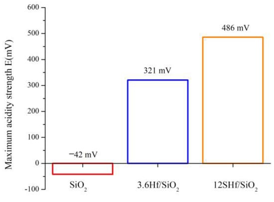 Maximum Acid Strength (M.A.S.) of catalysts was determined by potentiometric titration with n-butylamine. The first reading recorded, in mV, indicates the acidic character of the materials. Pizzio et al. [29] lassified surface acidity of solid catalysts into very strong acid sites (E > 100 mV), strong acid sites (0 < E < 100 mV), weak acid sites (−100 < E < 0 mV), and very weak acid sites (E < −100 mV). Figure 8 shows the M.A.S. developed by SiO2, 3.6Hf/SiO2 and 12SHf/SiO2. SiO2 lacks acid sites, which is confirmed by the −42-mV reading, but when hafnium was introduced into the silicate the surface acid strength of the material increased to 321 mV. The higher the hafnium oxide content, the higher the M.A.S. On the other hand, sulfate ions impregnated in the 3.6Hf/SiO2 material cause a significant increase in the acidity of the catalyst. From these results it is inferred that catalysts 3.6Hf/SiO2 and 12SHf/SiO2 will be promising for carrying out acidity-demanding reactions, such as alcohol dehydration and other reactions like those typically found in petroleum refineries.