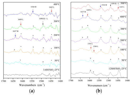 FT-IR spectroscopy with adsorption-desorption of pyridine (a) Hf/SiO2; (b) 12SHf/SiO2. L: Lewis’s acid sites (*), B: Brönsted acid sites (+), B + L: Lewis-Brönsted-type acid sites (°).