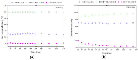 Methanol dehydration: (a) 3.6Hf/SiO2 and (b) 12SHf/SiO2 at 340 °C.