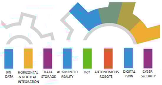 Industry 4.0 concentrates on intelligent processes within the industrial system, these processes being driven by technologies classified as digital such as IoT, Big Data, CPS and Cloud Computing (see Figure 1) provide continuous data capture and also, by utilisation of intelligent sensors, a real-time monitoring of individual processes. The entire system of process monitoring, data collection and data processing is mainly implemented by using the Internet and transferring this captured data to large storages within the organisation []. Industry 4.0 brings new solutions to achieve flexibility and high performance, allowing machines to communicate with each other and use all data inside and outside the industrial process. This allows machines and equipment to operate autonomously and efficiently. This also makes the communication between machines and humans easier, whatever their location, and enables the interaction of multiple devices [].