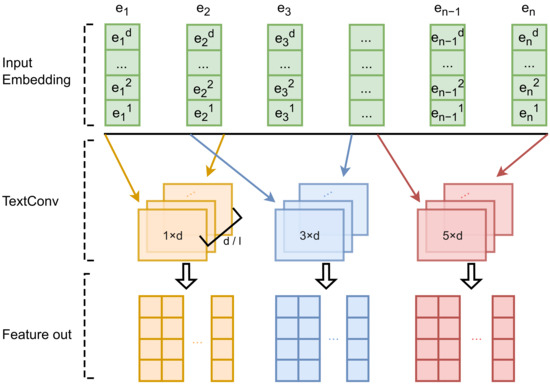 The convolution operation maps the original text sequence from the word space to a semantic feature space with higher information content. In this way, we can obtain the output matrices of the convolution layers, i.e., . These output matrices contain various local features in the input sequence, such as word combinations, phrases, and sentence structures. Through these features, we can better capture the semantic information of the text, thereby improving the performance of text classification tasks.