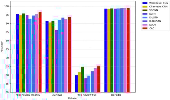 We compared the classification accuracies of the CAC model and several baseline models on each dataset. The results showed that our proposed model achieved higher accuracy than the other models on most datasets. Table 2 summarizes the accuracy results of different baseline models compared to our proposed model on each dataset. Based on these experimental results, we can conclude that the CAC model has a high performance in text classification tasks and can serve as a strong benchmark model for future research and applications.