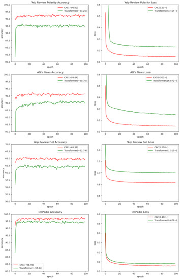 We conducted experiments on the Yelp Review Polarity, AG’s News, Yelp Review Full, and DBPedia datasets to calculate and analyze the results of the Transformer model and the CAC model. We plotted the accuracy and average loss curves of the models across each epoch, as shown in Figure 6.