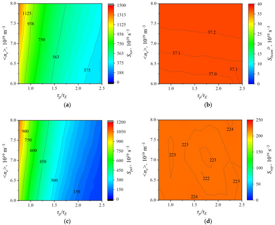 (a) Variation of total ion flows Stot and flows from separate particle sources: (b) from the beam Sbeam, (c) from the pellets and (d) flow of neutrals through the separatrix Ssep in the working window of densities <ne> and confinement parameters τp/τE.