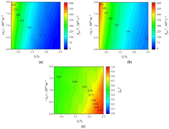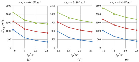 It is shown in Figure 1 that, to provide higher values of τp/τE, it is necessary to decrease the particle diffusion coefficient. The range D/χe = 0.2–0.75 presented in [18] in the case of DEMO-FNS facility provides the variation of confinement parameters τp/τE = 0.5–2.25. At the same time, in calculations with higher density, the diffusion coefficients are lower (see Figure 1).