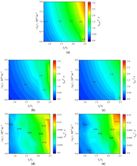 Using the ion equations for calculations and the resulting more accurate determination of “partial confinement times” for particles in the plasma led to the increase of partial confinement times of beam particles and pellets by up to 2.5 times (in the corresponding working points). However, for the source of particles in the form of neutrals entering the plasma through the separatrix, the particle confinement times decreased up to 3 times. Due to this, the deposition of particles from different sources to the density of the core plasma changed compared to the previous estimates [8]. The increase of “partial particle confinement times” (Figure 5) led to the decrease of required particle flows (the strength of particle sources). Thus, Figure 2 shows the flows into the plasma from pellets, which are 2.7 times lower than those determined earlier (in the corresponding working points). The diffusion particle losses from the plasma are also lower than those calculated earlier, which leads to a proportional increase of gas puffing (see Equations (2) and (3) in [8]). Figure 5b–e shows the differences of corresponding times for different ions. The confinement times of ions from pellets shown in Figure 5b,c are longer than the injection times 1/fpel < 0.1 s (see Section 3.3). This indicates that the estimates are reasonable, since pellet injection will occur more quickly than the characteristic density decay times.