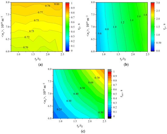 Variation of total confinement times for (a) energy τE, (b) ions τp and (c) ions, without accounting for recycling τtot in the working window of densities <ne> and confinement parameters τp/τE.