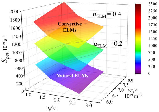 is observed (see Figure 10). As a result of the increase of flows from the plasma and from pellets that miss the plasma, at a constant Ssep and constant pressure pn, additional gas injection SGIS has to be decreased. In the absence of a base value for SGIS, in some working points (e.g., τp/τE ~ 1 for αELM = 0.4), the pumping rate 20 m3/s is insufficient to provide the required pressure of pn = 2 Pa. It has to be increased to 22–25 m3/s (see the separate markers: the crosses and the yellow dot in Figure 11) when the value of SGIS becomes almost zero. Since the additional flow of particles from the pellet “shards” that have missed the plasma core SHFS (1/keff_HFS − 1) cannot be turned to zero in the case of unpredictable gas desorption from the wall, the only controlling parameter remains the value of SGIS.