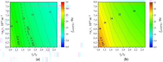 Frequency of fuel pellet injection (HFS) that contain 10% of the amount of particles Ncore and the required frequency of pellet injection for stimulation of ELMs with δWELM ~ 0.5 MJ (and below) at (a) αELM = 0.2 and (b) αELM = 0.4 in the working window of densities <ne> and confinement parameters τp/τE. The scales on the right show the agreement between color and values of fpel.