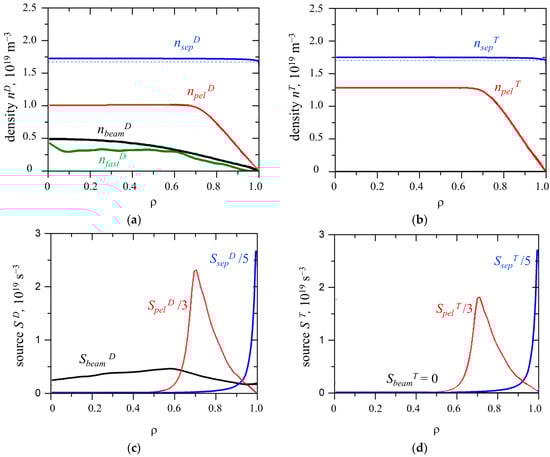 The earlier used model assumes that the core plasma is replenished by particles from three different sources (neutral beam injection, pellet injection, and gas supply to edge/SOL) that have different confinement times. These “partial” confinement times were determined after some sources were artificially decreased by ~10% [7]. Since, in earlier simulations by the ASTRA and SOLPS codes the hydrogen isotopes were not distinguished, in order to estimate that deuterium and tritium flows by the FC-FNS code, we used an additional assumption that the transport coefficients of the D and T particles were equal in the core plasma. This assumption is rather rough and may carry a potential inaccuracy for the result (so the flows may be in opposite directions for D and T—see [3,14]). Theoretically, it is possible to introduce different transport coefficients for different isotopes, yet there is no detailed data on the particle transport of different isotopes, and in particular on the mixing of isotopes. The existing theoretical estimates and experimental data (see, e.g., [15]) indicate that the dependence of particle confinement on its mass is relatively weak, ~m1/2. Therefore, taking into account the ratio of T/D masses that is equal to 1.5, the above assumption appears reasonable. The relative concentration of tritium in the core plasma is determined by the ratio of intensities of the D and T sources and by the distribution of the different sources across the cross section of the core plasma. Note that, in simulations by the ASTRA code in [7], the diffusion coefficients were normalized so as to provide the given global particle confinement times τp in the plasma column.
