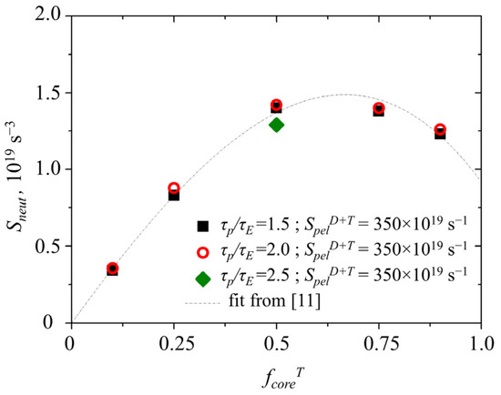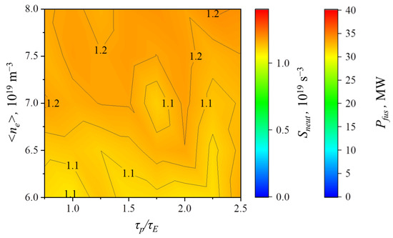 It was already noted [13,41] that the total fusion power Pfus is formed by the plasma–plasma and beam–target components and the ratio of these values depends substantially on the plasma and beam compositions. Since, to date, the most promising variant is that using the deuterium NBI, calculations were carried out for this. The obtained dependences of neutron yield Sneut on fcoreT (see Figure 14) are in relatively good agreement with the earlier obtained results [13]. The maximum values of neutron flow can be obtained at fcoreT = 0.7 for the D0 beam. In the considered case with fcoreT = 0.5, the neutron yield turns out to be approximately 10% lower than expected, similar to the total fusion power. The dependence of neutron yield Sneut on plasma parameters: density <ne> and confinement parameter τp/τE is shown in Figure 13. It is seen that, in the considered working window, the values are quite uniform.