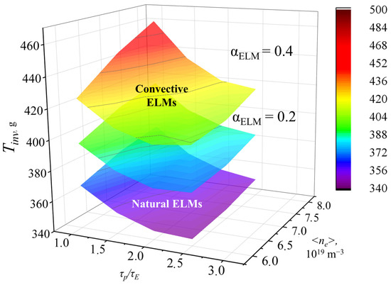 The change of the pellet ion source Spel (i.e., the flow of D + T particles required to fuel the core plasma in the form of pellets injected from the high magnetic field side (HFS)), taking into account convective ELMs (in addition to “natural” ELMs) calculated in a manner similar to [8], is shown in Figure 7. It is seen that the increase in fuel flow to compensate for the particle losses in ELMs is 2–3 times, depending on αELM, which has to be accounted for in requirements for the system of pellet injection. The flows of particles from pellets into the plasma are up to 1.6 times lower than those calculated earlier (in the corresponding working points). The considered range of flows through the pellet injection system corresponds to the chosen requirements to the pellet injection system (PIS) of ITER and it is twice as small even for the maximum values of Spel and αELM. From this, one can conclude that, even taking into account the additional flow of particles needed to stimulate ELMs from the low magnetic field side (LFS), the considered requirements for the PIS system are achievable from the engineering standpoint.