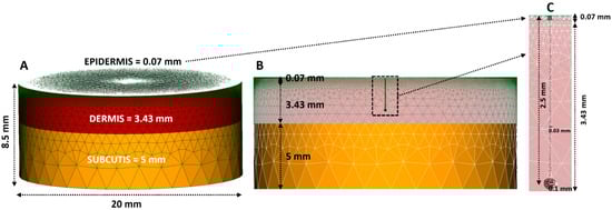 Finite element method (FEM) Model #1 of skin and hair. The model includes the epidermis, dermis, subcutis, hair shaft, and follicle and has a radius of 10 mm and a height of 8.5 mm; the thickness of the epidermis, dermis, and subcutis is 0.07 mm, 3.43 mm, and 5 mm, respectively; the cylindrical hair shaft has a radius of 0.03 mm and a length of 2.5 mm. The follicle has a radius of 0.1 mm and is located at a depth of 2.5 mm. (A) 3D representation of the whole model; (B) cross-section through the model center; (C) detailed view of the hair shaft and follicle.
