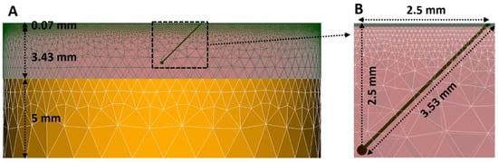 Finite element method (FEM) Model #2 of skin and hair with the hair exiting the skin at an angle of 45°. (A) Cross-section through the model center; (B) detailed view of the hair shaft and follicle.