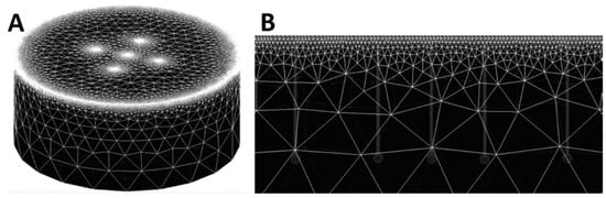 The surface density of hair on human skin has on average 14–32 hair follicles per square centimeter [20], which we have taken into account with the even more realistic FEM Model #3, with an array of hair arranged in the shape of a cross (Figure 3); this arrangement corresponded to a density of 18 follicles per square centimeter.