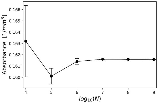 The Monte Carlo methodology is a stochastic technique with random sampling, and thus its accuracy inherently depends on the number of simulated photons. To address this attribute, we calculated the absorbance in the hair follicle of the FEM Model #1 for different numbers of photons, ranging from 104 to 109. The simulated laser beam was disc-shaped with a radius of 4 mm and directed perpendicularly to the short-axis center of the FEM Model #1. The average absorbance value of the entire hair follicle was determined by interpolating and spatially integrating values at its vertices. The mean value over the follicle was evaluated ten times (from ten independent simulations), and then the average and standard deviations were calculated, which are presented in Figure 4. The average absorbance was normalized, meaning that the source power was set at 1 W.