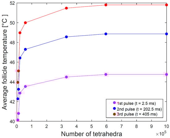 Figure 5 shows the dependence of the average temperature of the hair follicle immediately after the first, second, and third pulses, respectively, on the number of tetrahedral FEM elements. We can conclude that the average temperature of the hair follicle starts converging at roughly 500,000 elements, which was taken as the minimal number of elements in our simulations. FEM Model #1 thereby had 422,742 elements, FEM Model #2 had 453,775 elements, and FEM Model #3 had 586,633 elements.