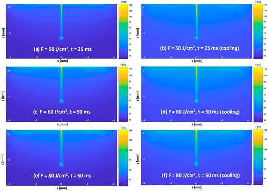 Temperature distribution maps shown in the y = 0 plane for FEM Model #1 immediately after irradiation for three combinations of fluence, pulse duration, and modes without forced cooling and with forced cooling. The left column shows maps without forced cooling and the right column with forced cooling for fluences of: (a,b) 50 J/cm2 and 25 ms; (c,d) 60 J/cm2 and 50 ms; (e,f) 80 J/cm2 and 50 ms.