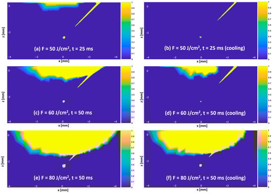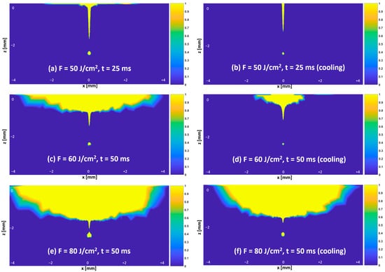 Thermal damage distribution maps shown in the y = 0 plane for FEM Model #1 immediately after irradiation for three combinations of fluence, pulse duration, and modes without forced cooling and with forced cooling. The left column shows maps without forced cooling and the right column with forced cooling for fluences of: (a,b) 50 J/cm2 and 25 ms; (c,d) 60 J/cm2 and 50 ms; (e,f) 80 J/cm2 and 50 ms.