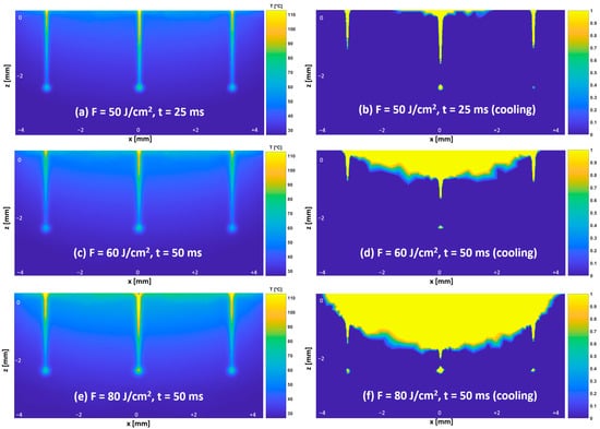 Temperature and thermal damage distribution maps shown in the y = 0 plane for FEM Model #3 immediately after irradiation for three combinations of fluence and pulse duration for a mode without forced cooling. The left column shows temperature distribution maps, and the right column shows thermal damage distribution maps, with fluences of: (a,b) 50 J/cm2 and 25 ms; (c,d) 60 J/cm2 and 50 ms; (e,f) 80 J/cm2 and 50 ms.