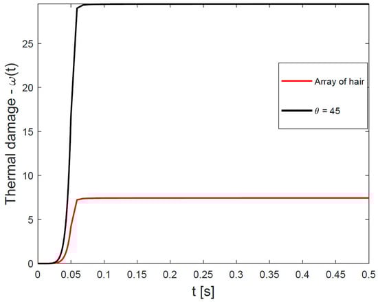When inspecting the results of cumulative heat damage to the hair follicle for FEM Model #2 and FEM Model #3, shown in Figure 10, we notice that the pulse itself and a short cooling-down period after the pulse contributed the most to the final thermal damage to the hair follicle; in our case, this amounted to 50 ms of the pulse duration and about 20 ms after the pulse, i.e., 70 ms in total. We can hypothesize that the heat damage to an array of hair may have been insufficient to reach necrosis of the hair follicle, which is in line with observations in FEM Model #3 under Protocol #1 (Figure 9).