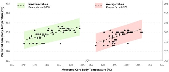 Relationships between the predicted and measured core body temperatures. Dashed lines and shaded areas indicate the linear regression model and 95% confidence interval for the average (top graph) and maximum (bottom graph) core body temperatures measured during each trial.