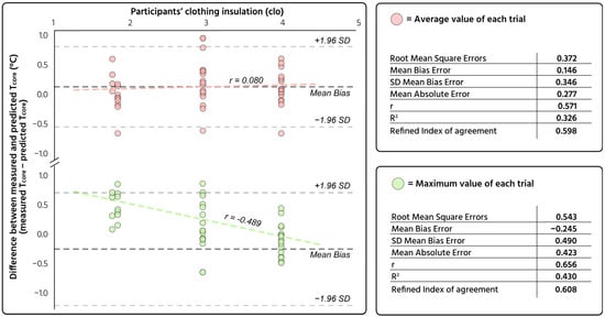 Error indices and average differences between measured and predicted core body temperatures (Tcore). Pink and green circles represent the average and maximum Tcore measured during each trial, respectively. Dark thick and light-grey dashed lines represent mean bias and 95% confidence interval, respectively. Pink and green dashed lines represent the associations between participants’ clothing insulation and the difference between their measured and predicted Tcore during each trial.