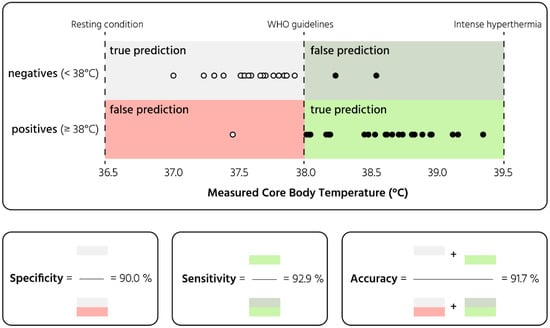Predictive capacity of the newly developed mobile phone application in pre-classifying individuals with an increased risk of experiencing elevated physiological heat strain, determined as core body temperature higher than the guidelines (≥38 °C) of the World Health Organization (WHO). Specificity and sensitivity correspond to the ability of the newly developed mobile phone application to correctly predict individuals that will or will not experience elevated core body temperature, respectively. Accuracy corresponds to the percentage of correct predictions made by the newly developed mobile phone application.