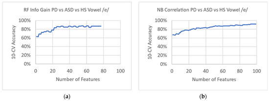 The number of features needed to reach the maximum possible accuracies varied with respect to the vocal test, feature selection methods, and classifiers (Figure 1). The feature selection method that was a combination of the Correlation sentence MLP had the least number of features (52), whereas the Correlation Vowel/e/NB combination had the most (99).