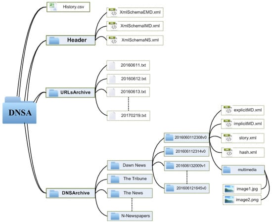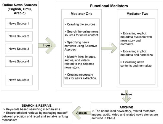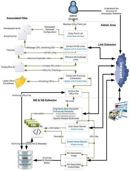 - A digital news story extractor (DNSE) tool was specifically designed to extract news articles from diverse sources and compile them to form the DNSA. Its primary function is to collect and gather news articles from various online sources, ensuring their preservation within the DNSA [];