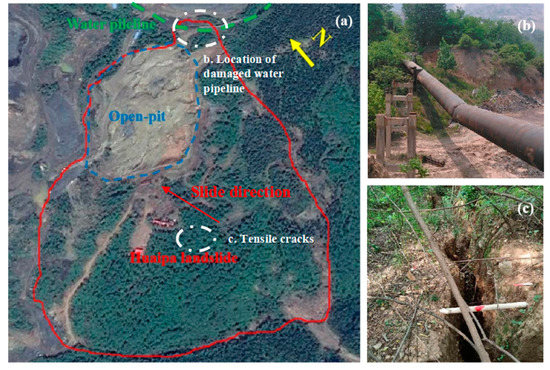 Geomorphology of the Huaipa landslide. (a) Topographic and geomorphological setting of the landslide area and slide direction. (b) Photographs of the damaged water pipeline at the foot of the slide. (c) Tensile cracks in the middle of the landslide.