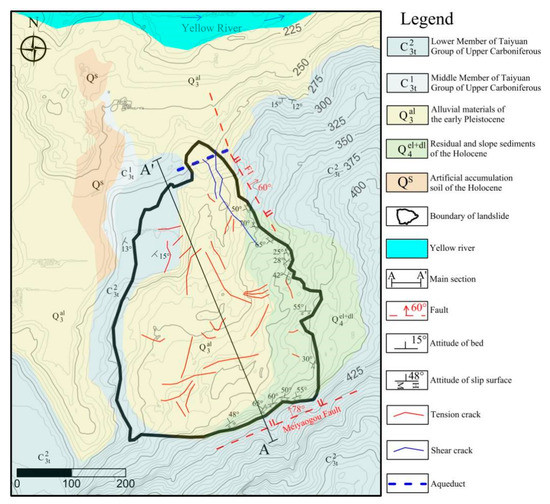 The landslide was controlled by the Meiyaogou fault, which is an F1 fault and fan-shaped (Figure 2). The landslide was approximately 495 m long in the north–south direction and approximately 370 m wide in the east–west direction on average, with an area of approximately 200,000 m2, an average thickness of approximately 20.0 m, and a volume of approximately 4,000,000 m3, making it a large mid-level landslide with a main slip direction of approximately 324°. The terrain is steeper at the trailing edge of the landslide and gentler in the middle. To the southwest of the front edge of the landscape area is a primitive landform with steep terrain. In the northwest direction, there is an aluminum mining area with flat terrain and a 10–25 m scarp along the east and south sides of the mining pit boundary with a slope degree of approximately 45°.