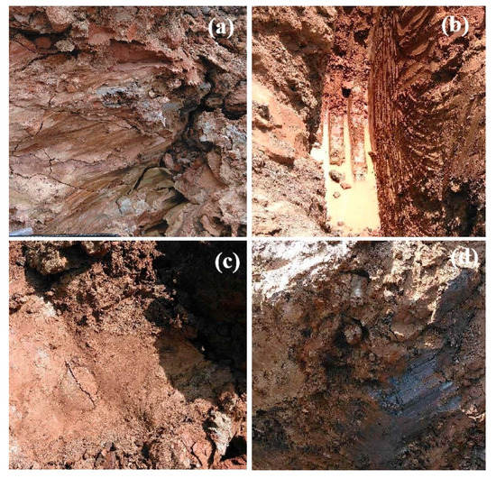 According to the field investigation and drilling exposure, the trailing edge of the landslide tension zone and main sliding zones is mainly distributed in Quaternary eluvium and deluvium deposits of gravel clay, strongly weathered sandstone and mudstone, and strongly weathered argillaceous sandstone. The sliding zone thickness is generally 1.0–1.5 m. The residual gravel clay is loose, the gravel soil has high water permeability, and the cohesive soil in the gravel soil is easily softened in water. In contrast, the lower weathered bedrock has poor water permeability. The groundwater mainly flows downward along the bedrock. Under groundwater action, the landslide softens and slides along the weathered bedrock. The sliding zone near the soil–rock contact zone is generally wet and saturated, containing a high water content, and is relatively soft. Extensive water seepage occurred when the sliding surface was exposed by drilling. There were also crumpled or micro-inclined bedding planes, mirrors, and scratches on the sliding surface, as shown in Figure 3.