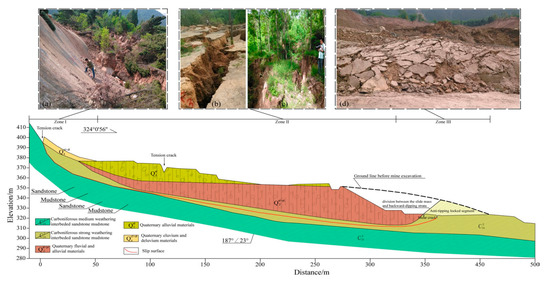 Engineering geological profile and photographs of the Huaipa landslide, showing the subzones of (a) the rear part of the slide and oblique trees, (b,c) tension cracks in the middle region, and (d) the distension zone in the front part of the slide [36].