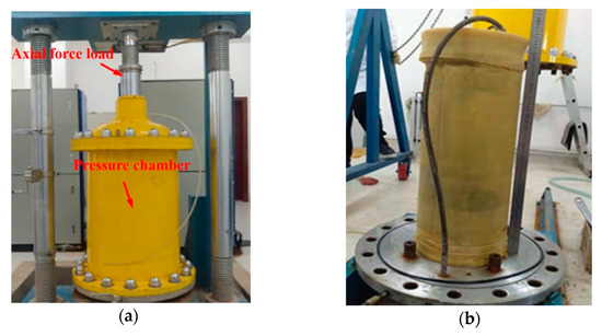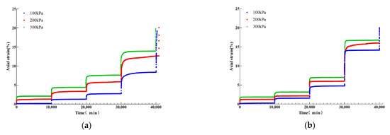 To study the creep properties of the strongly weathered argillaceous sandstone and their influencing factors, creep tests were performed using a large triaxial creep apparatus under natural and saturated water content conditions at confining pressures of 100, 200, and 300 kPa (Figure 6). The creep specimens with 13% natural water content were classified as unconsolidated undrained shears (UU tests), and the saturated creep specimens were classified as consolidated drained shears (CD tests).