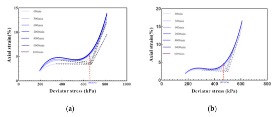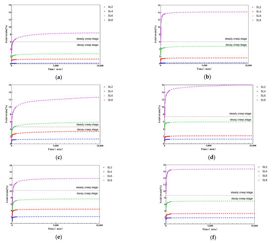 The full creep process can be divided into three stages (Figure 9): decay creep; steady creep; and accelerated creep [38]. The creep rate gradually decreased during the decay creep stage and remained approximately constant during the steady creep stage. Stable deformation occurred when the velocity was nearly constant. At lower stress levels, the specimens were dominated by instantaneous strain and stabilized at 3000–4000 min. The creep curve later approximated a horizontal steady state and the creep rate tended to zero. At this time, the specimen was in the decay creep stage and no damage occurred. As the stress level increased, the creep curve began to linearly increase at a lower creep rate and the specimen entered the steady creep stage. Upon maintaining this state, the specimen would have eventually been destroyed. The transition from decay creep to steady creep marked a turning point in the specimen’s creep characteristics, and the corresponding deviator stress at this point was the specimen’s long-term strength [39]. When a specimen was in the accelerated creep stage at higher stress levels, the strain rate increased rapidly and the sample rapidly sheared, causing damage.