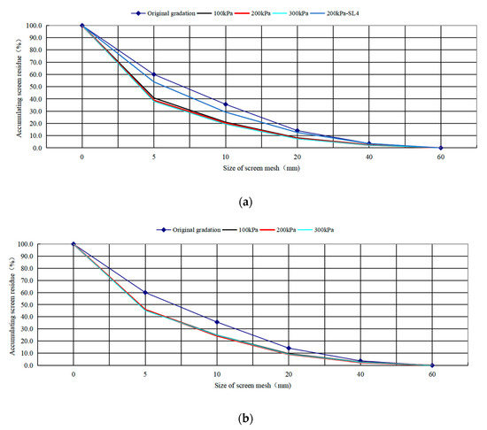 where ΔWk is the difference between the content of each grain group before and after the test, Wki is the content of a certain grade of grain group before the test, and Wkf is the content of the corresponding grain group of the same grade after testing. The grain size distribution curves of the specimens after the triaxial creep test are shown in Figure 9.