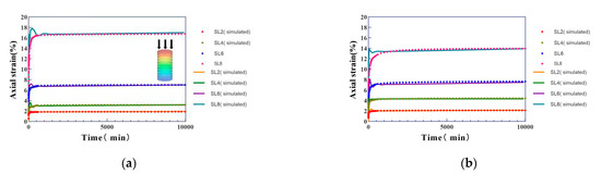 The thickness of the overburden layer on the sliding zone of the Huaipa landslide was approximately 15–20 m. The creep test curve with a confining pressure of 300 kPa was used to calibrate the creep parameters of the sliding zone. A series of triaxial creep tests were simulated to fit the Burgers–Mohr model creep parameters to the values listed in Table 6 using the trial difference method. The three-dimensional numerical model for the triaxial creep tests had a height of 60 cm and diameter of 30 cm, which is consistent with the test specimens. For the calculation, a confining pressure of 300 kPa was first applied to simulate the consolidation process prior to the creep test. After consolidation was completed, the corresponding deviator pressure was applied to simulate the triaxial creep test under different stress levels. The fitted curves are shown in Figure 12.