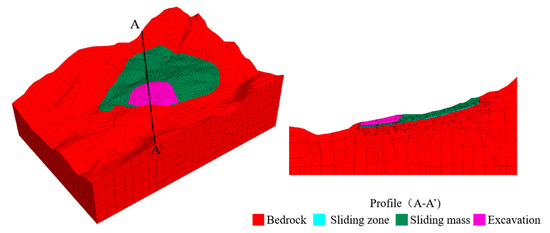 To simulate the catastrophic creeping process of the Huaipa landslide under excavation and rainfall, a three-dimensional geological model of the landslide was established according to the field investigation and engineering geological survey, as shown in Figure 13. In the calculation process, the elastic–plastic model was first used to analyze the deformation characteristics of the slope after the excavation of bauxite at the front edge of the slope in March 2013. The Burgers–Mohr model was used for the sliding zone to calculate the creep deformation of the slope under the condition of natural water content until April 2014. The creep deformation of the slope under the condition of sliding zone saturation caused by rainfall was then calculated until 2 May 2014. The calculated parameters are shown in Table 7.