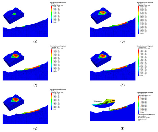 Deformation evolution process. (a) Excavation (March 2013) elastoplasticity analysis, (b) Natural state (creep time = 5 days), (c) Natural state (April 2014), (d) Saturation state (creep time = 395 days), (e) Saturation state (2 May 2014), (f) Displacement vector (creep time = 422 days).