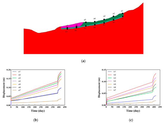 Displacement monitoring points were set up along the landslide slope surface and location of the slip zone, as shown in Figure 15a. The monitoring results are shown in Figure 15b,c. Under natural conditions, the slope was found to be in a stable creep state and the maximum deformation rate of the slope was approximately 9 cm/year. After rainfall saturation, the landslide deformation increased rapidly. However, the landslide deformation rate decreased gradually over time and the landslide activity tended to stabilize.