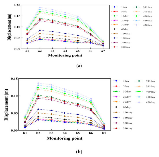 The deformation curves and displacement of the slope surface and sliding zone are shown in Figure 16, indicating similar characteristics at both locations. The deformation of the slope body was largest at positions a2 and b2, and the deformation gradually decreased toward the slope foot. After excavation, the slope foot deformation was considerably reduced at positions a6 and b6, which indicates that the landslide was caused by the thrust load in the creep sliding process.