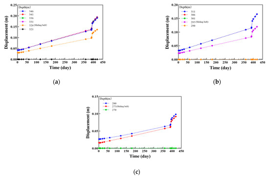 Displacement monitoring curves at different locations and depths in the slope. (a) Rear region of the slope, (b) Middle region of the slope, (c) Front region of the slope.