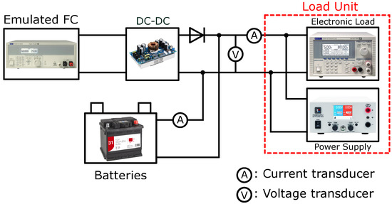 The proposed hybrid fuel cell topology is composed of an emulated fuel cell, whose role is to be the main power source and to follow the slow-dynamic part of the load, and two series-connected 12 V batteries that have to handle the fast-dynamic component of the load. The FC is interfaced with the DC bus through a DC-DC converter that brings the FC voltage to the level of the batteries’ voltage and acts as the power conditioning unit. On the contrary, no converter is used on the battery side. Downstream of the converter, a diode is placed to avoid current flow from the bus to the emulated FC. In this topology, the voltage of the DC bus is determined by the batteries and is characterized by some fluctuations due to changes in the power demand. A schematic representation of the powertrain structure is shown in Figure 2.