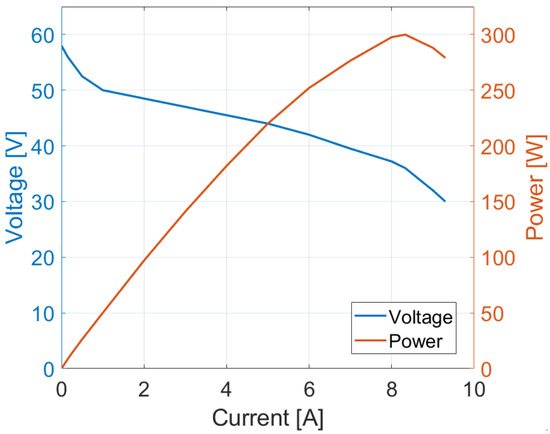 For the emulation of the fuel cell, a controlled DC power supply (PS) is used. For the experimental setup, the Aim-TTi QPX1200 power supply manufactured by Aim-TTi (Thurlby Thandar Instruments, Huntingdon, UK) is adopted and controlled analogically to reproduce a real FC V-I curve. This power supply has a rated power of 1200 W and operates with a current range of 0–50 A and a voltage range of 0–60 V. The current provided by the emulated FC is measured through a microcontroller using the power supply current monitor port, which generates a 0–5 V analogue signal proportional to the current. The microcontroller translates the analogue signal into the corresponding current value, then, through a 1-D look-up table that represents the V-I curve, evaluates the corresponding voltage. In the end, the microcontroller translates the voltage value into a 0–5 V analogue signal that is sent to the voltage control port of the power supply. The microcontroller adopted is an ATmega2560, and the microcontroller board is an Arduino Mega 2560. This microcontroller is not able to generate an analogue signal between 0–5 V, but it can generate a pulse-width modulation (PWM) signal. Therefore, the PWM signal is converted into a 0–5 V analogue signal by a resistor–capacitor (RC) filter with a cut-off frequency of 48 Hz. For the FC emulation, the FCS-C300 fuel cell manufactured by Horizon Fuel Cell Technologies (Horizon Fuel Cell Technologies, Singapore) is taken as a reference. Its main properties are reported in Table 1, while its characteristic curves are shown in Figure 3.