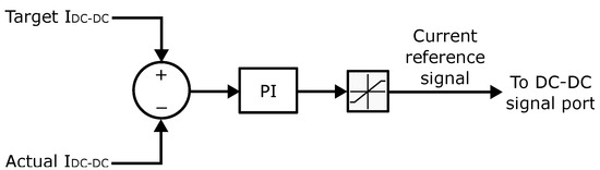 The adopted EMS is based on a PI controller. Only proportional and integral action were considered sufficient for the case study of this paper. In the emulated powertrain, the FC is the primary energy source and must follow the low-dynamic part of the load. Thus, the EMS was developed such that the FC follows the load demand with a slow time of response. From the measurement of the batteries’ current and the load current, the control unit evaluates indirectly the current provided by the emulated fuel cell downstream from the power converter (IDC-DC). The PI controller evaluates the current reference signal (IDC-DC) to the DC-DC so that the batteries current is equal to zero or the power delivered by the emulated FC corresponds to the power demand. As a consequence, the adopted EMS behaves as a charge-sustaining strategy with low reactivity. If the external load power demand is negative, as during regenerative braking, the PI setpoint FC current is set equal to zero. If the external load power demand exceeds the power capabilities of the emulated FC, the reference current for the PI controlled is saturated to a value that corresponds to the nominal power of the emulated FC. The PI gains can be set such that the response time is slow, allowing for a significant reduction in the FC output power oscillations. However, a tuning procedure for the determination of the PI gains must be performed. Figure 6 shows a schematic representation of the control strategy for the current reference signal. As for the voltage reference signal, the value is set equal to the maximum allowable recharging voltage for the batteries. According to this, if the load demand drops abruptly so that the current provided by the emulated FC would exceed the maximum charging current for the batteries, the voltage reference becomes the limiting signal and the current does not exceed the limit.